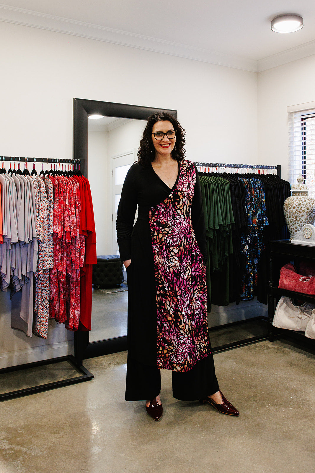 Designed to create beautiful length and fluid movement, the ALEXIS Crossover with Side Splits in Black Allure with Protea Panel forms an elegant, elongated silhouette. The wrap inspired ALEXIS Crossover front sits above the waist and just below the bosom, creating a softly defined and beautiful shape. The extended length gives the illusion of a dress, while remaining wearable over pants.