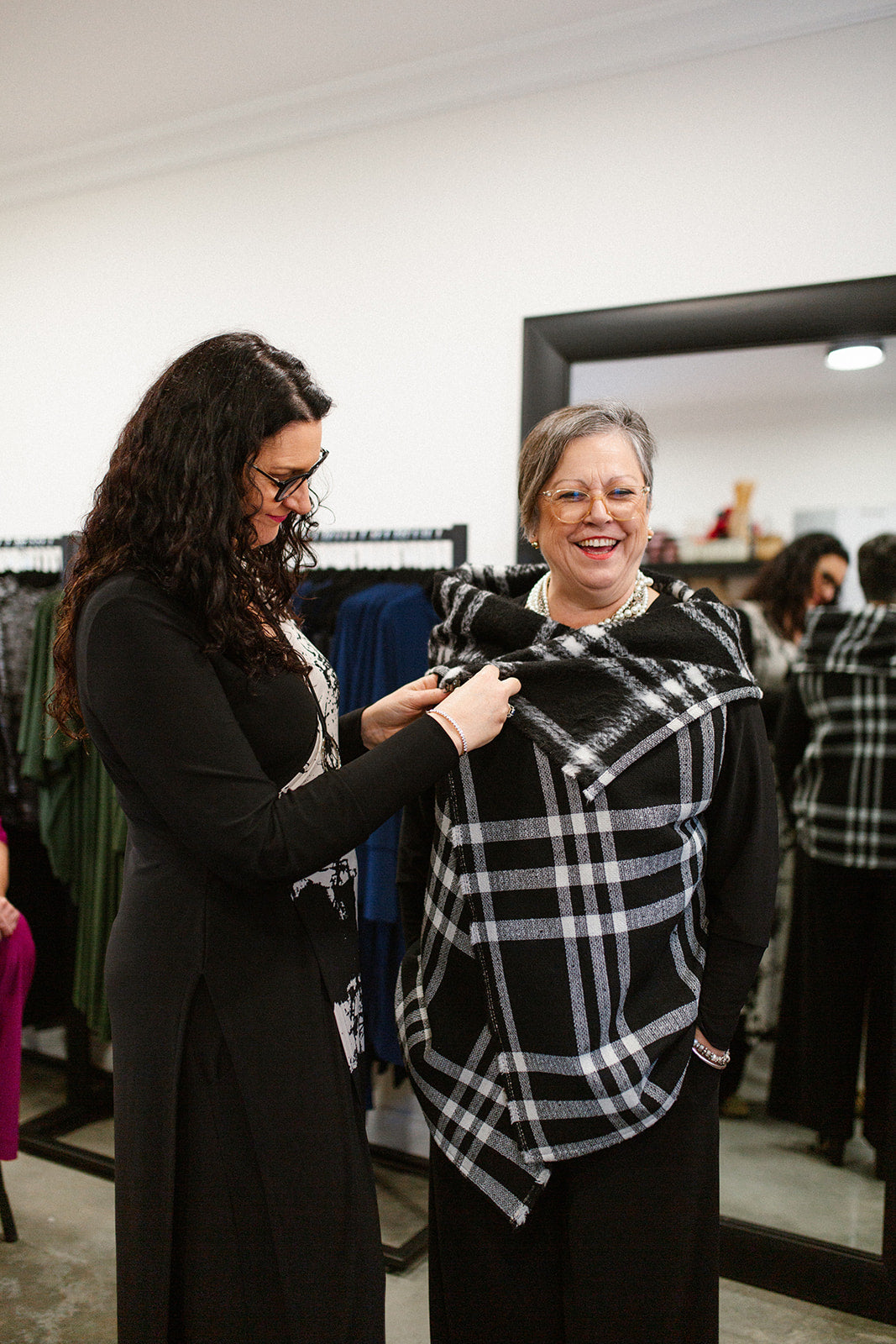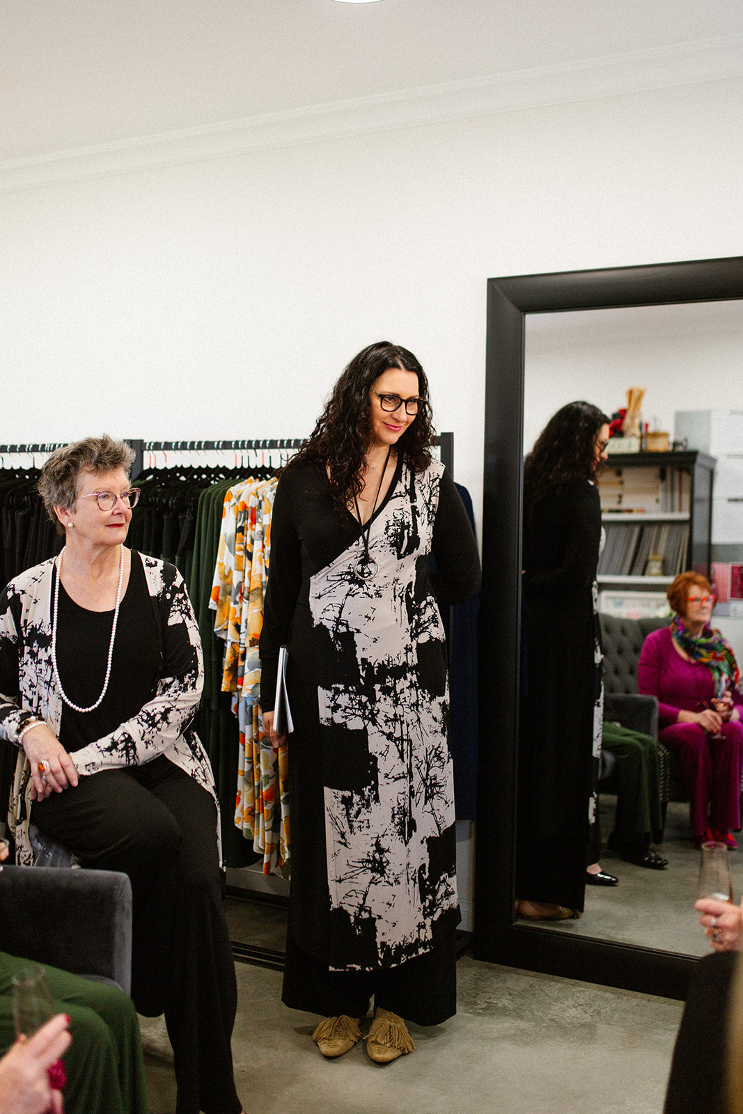 Designed to create beautiful length and fluid movement, the ALEXIS Crossover with Side Splits in Black Allure with Winter Scape Panel forms an elegant, elongated silhouette. The wrap inspired ALEXIS Crossover front sits above the waist and just below the bosom, creating a softly defined and beautiful shape. The extended length gives the illusion of a dress, while remaining wearable over pants.